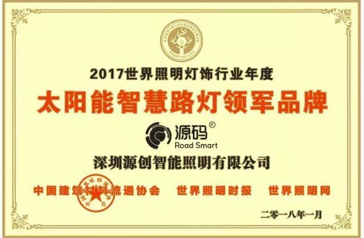 源碼太陽能智慧路燈2017年12月27日,由中國建筑材料流通協(xié)會照明燈飾委員會、世界照明時報、世界照明網(wǎng)、易微網(wǎng)絡(luò)股份主辦的“第9屆世界照明燈飾行業(yè)年度品牌風(fēng)云榜頒獎典禮”在星光聯(lián)盟國宴廳盛大舉辦,奏響了2017歲末年終中國照明行業(yè)最輝煌的一曲樂章。