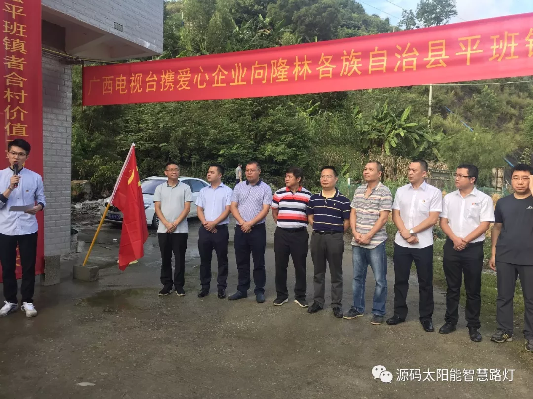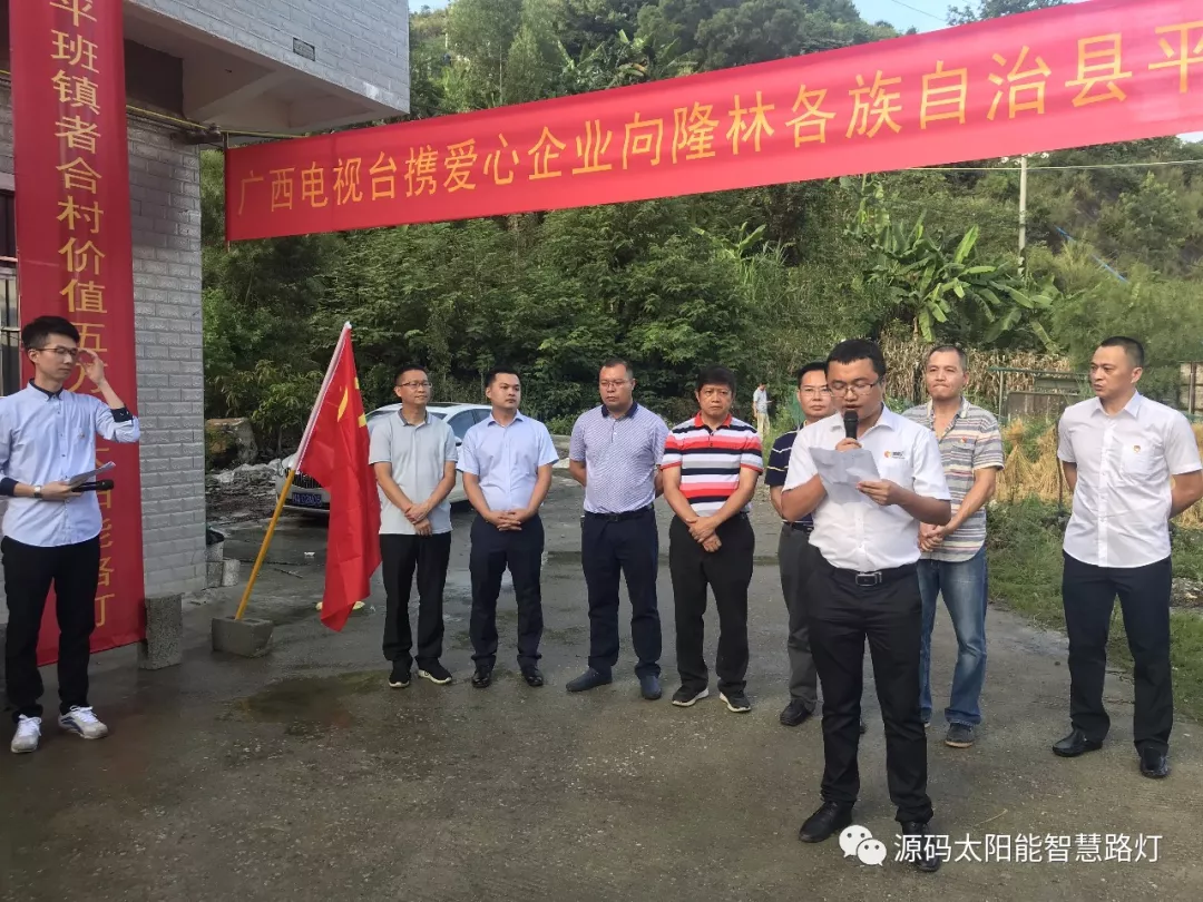 8月31日下午,源碼太陽能路燈聯合廣西電視臺向百色隆林平班鎮者合村捐贈太陽能路燈。此次捐贈的路燈,不僅亮化了村莊,更照亮了鄉親們的幸福生活。對者合村進一步提高村級基礎設施水平、保障農村群眾夜晚出行安全,保障和改善民生將發揮積極作用。