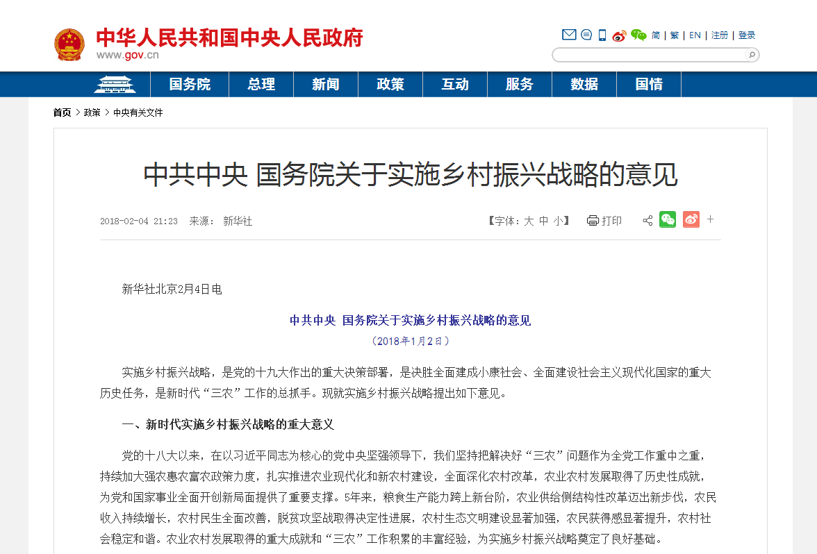 2018年1月2日,公布了2018年中央一號(hào)文件,即《中共中央國務(wù)院關(guān)于實(shí)施鄉(xiāng)村振興戰(zhàn)略的意見》 。2018年3月5日,國務(wù)院總理李克強(qiáng)在作政府工作報(bào)告時(shí)說,大力實(shí)施鄉(xiāng)村振興戰(zhàn)略。