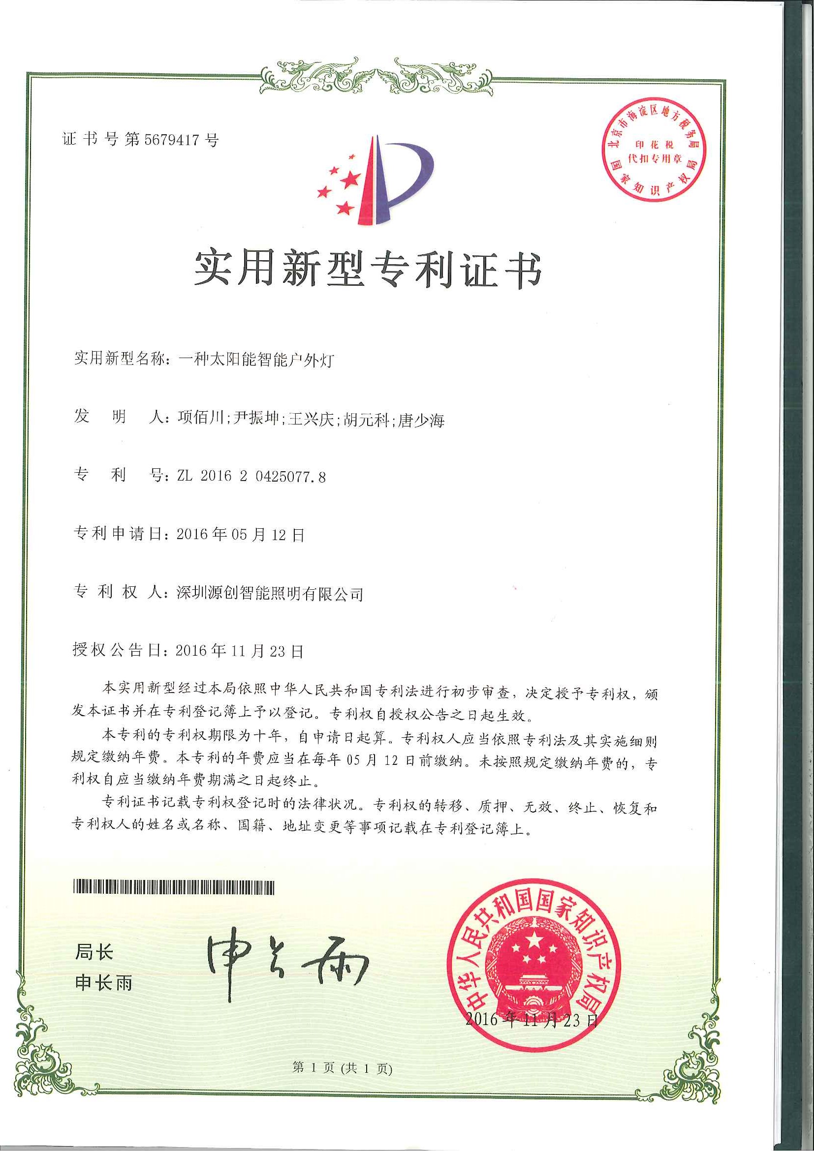 實用新型專利一種太陽能智能戶外燈